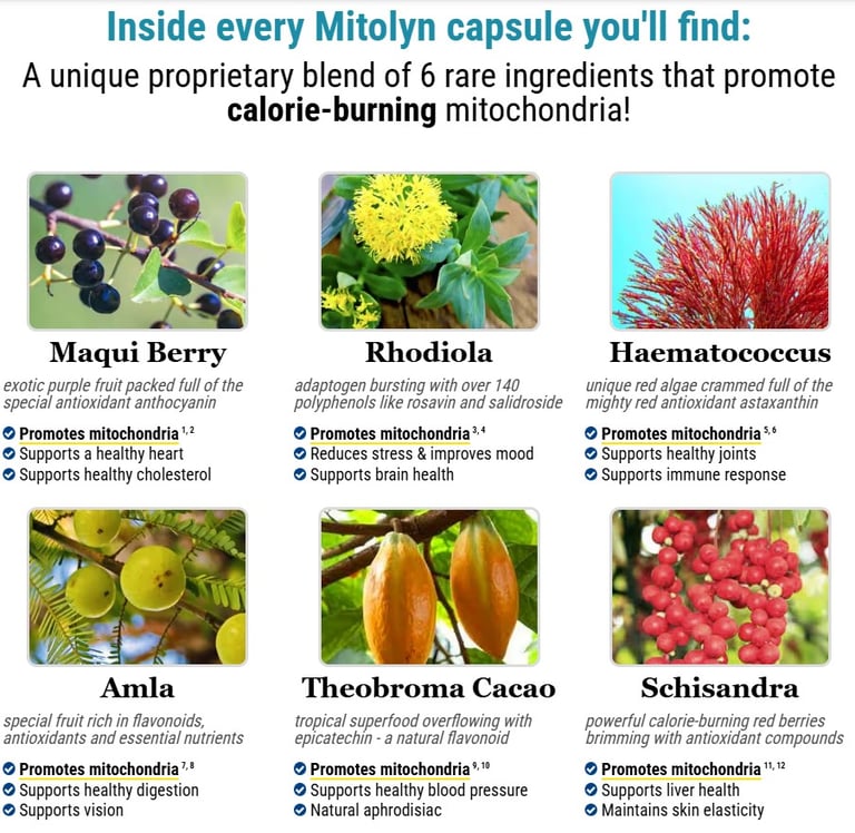 Mitolyn is a targeted fat burner designed to address a slow metabolism by focusing on underperforming mitochondria. Its proprietary blend of 6 plant-based nutrients is formulated to enhance mitochondrial function in three key ways:
